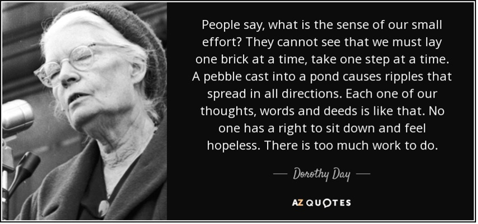 The church may look small and weak in the world. But God always changes the world through small and humble people. We cannot all be Dorothy Day. But we can offer one warm meal to someone. We can pray sincerely for one person. When we begin small acts of love, the Lord is with us.